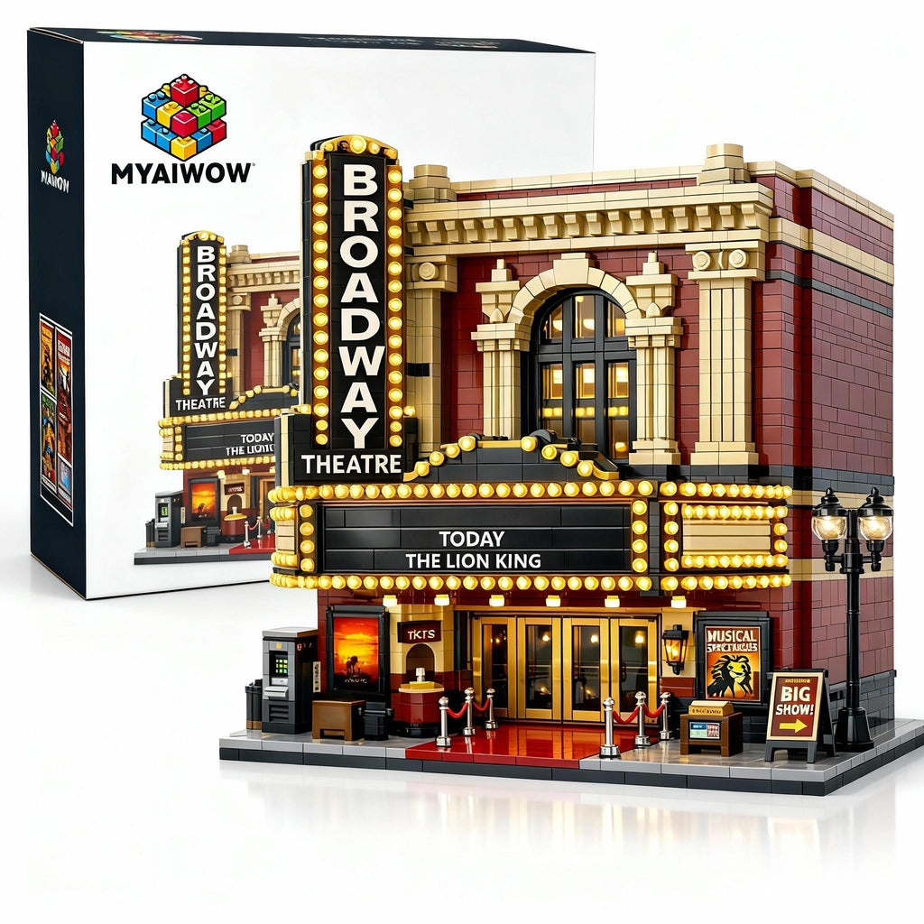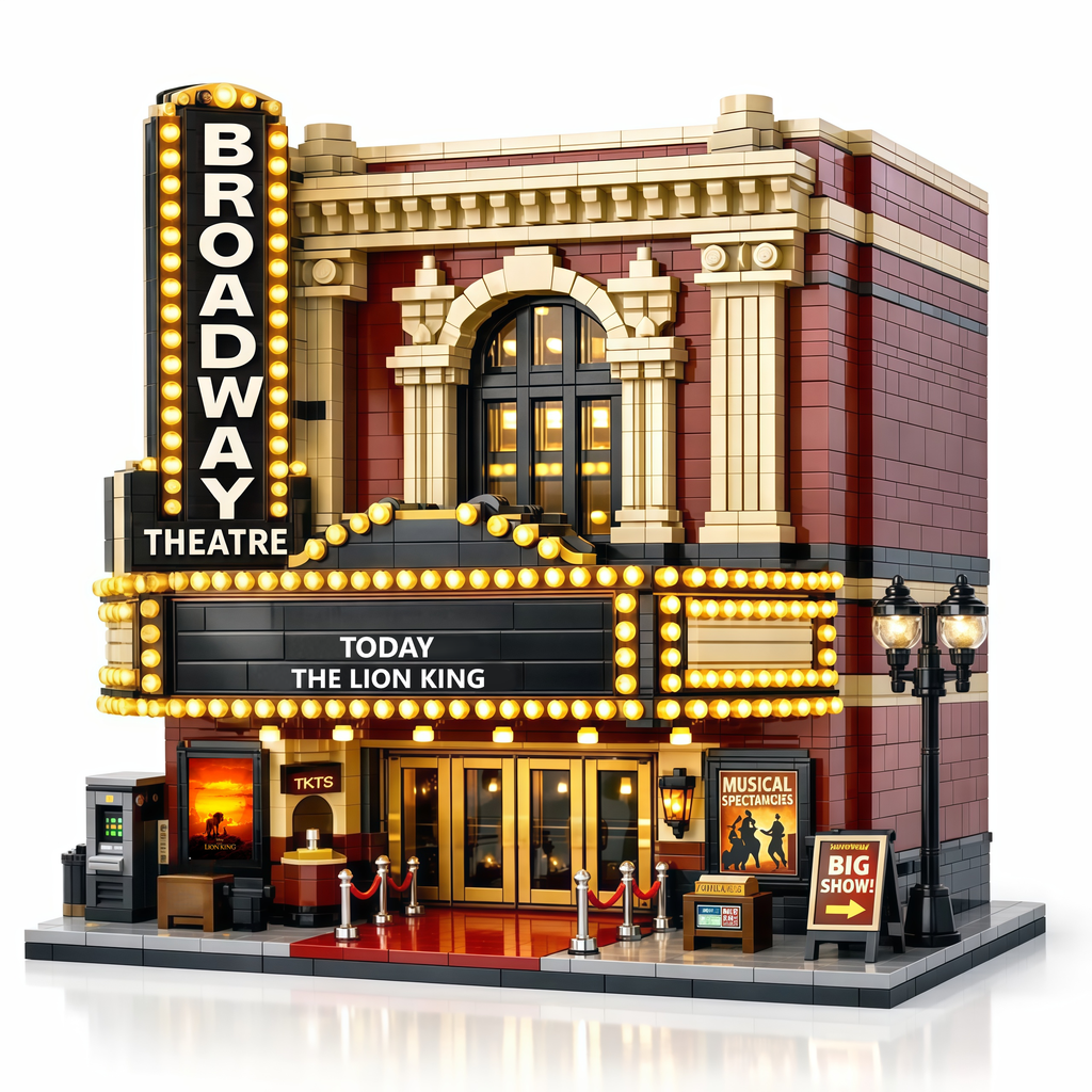 ✨ Inspired by a classic Broadway theatre in New York City, this building block model captures the iconic red-brick façade, creamy stone columns, and arched windows that define a familiar urban silhouette. The marquee reading “TODAY · THE LION KING” feels like a real moment in time—preserved just as it was.